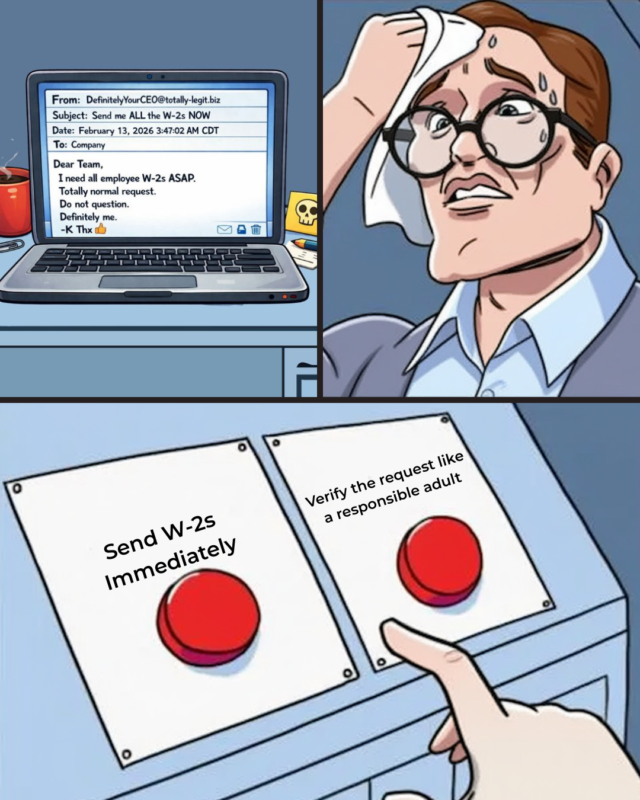 Make a “no W-2s via email” rule. Period. No exceptions. W-2s and other sensitive payroll documents do not leave your building through email attachments. If someone asks for them via email, the answer is “no,” even if it looks like the CEO.